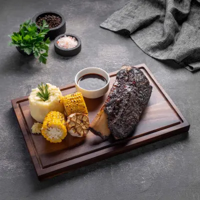 Wagyu beef stuffed with vegetables and cheese, served with sautéed vegetables and mashed potatoes.