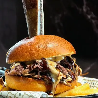 Slow-cooked brisket layered with melted cheddar cheese and jalapenos, served in a buttery brioche bun with BBQ cocktail sauce. comes with a side of crispy french fries and cocktail sauce.