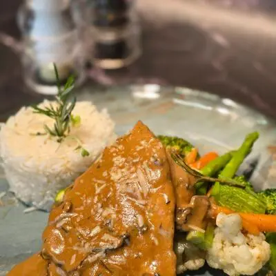 Two charcoal-grilled chicken breast served with mix vegetables in creamy mushroom sauce, paired with dill rice and garnished with sakura,