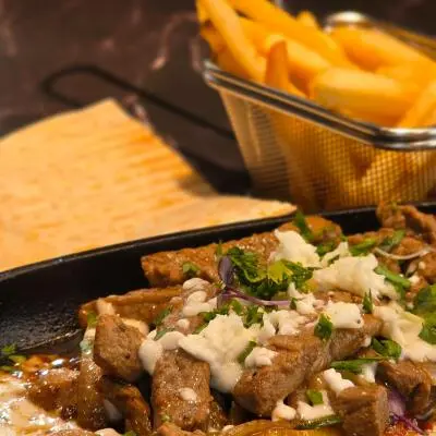 Sizzling slices of seasoned beef fajita, topped with melted mozzarella cheese. Served with crispy French fries, cocktail sauce, and warm tortilla bread on the side.